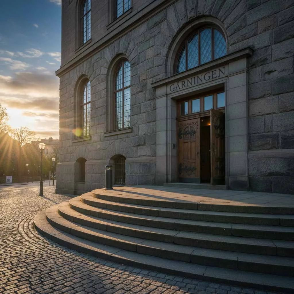 Historic Swedish courthouse in Stockholm with sunlight and the word Gärningen engraved above the doorway, symbolizing law and cultural meaning.
